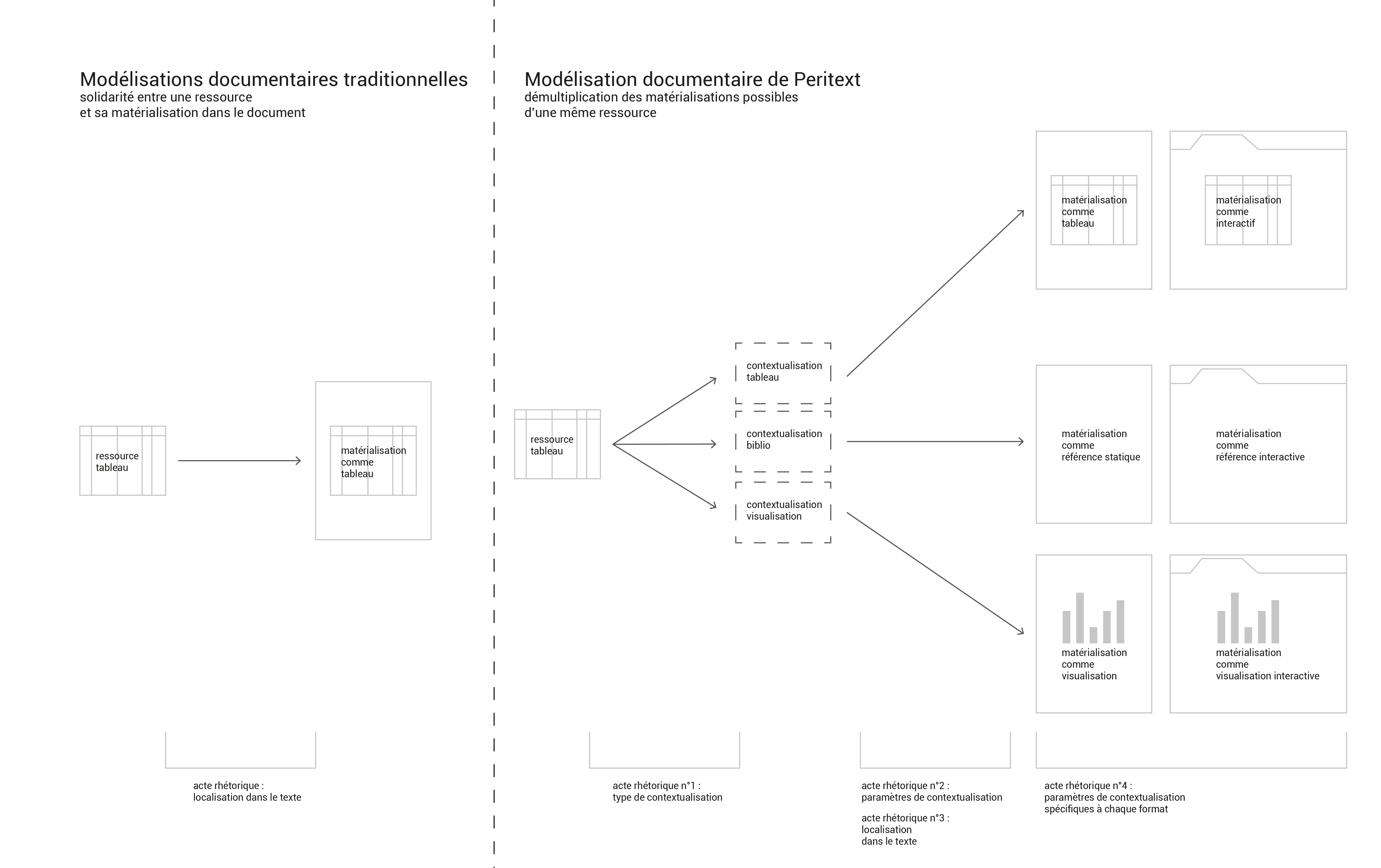 Les métatextes numériques ne sont pas de simples commentaires sur un ensemble de textes. Dans de nombreux cas, ils contiennent des protocoles qui permettent des procédures dynamiques dʼanalyse, de recherche et de sélection, ainsi que dʼaffichage. Plus important encore, les métatextes expriment des modèles du champ de connaissances dans lequel ils opèrent.48 (Johanna Drucker, 2009, p. 11)