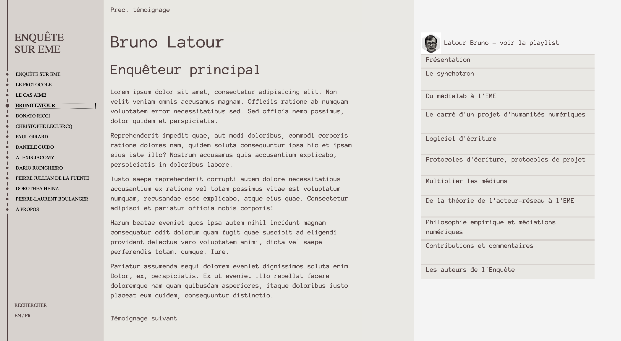 Nous avons tout expérimenté, du modèle à la façon de faire défiler… Au début nous utilisions beaucoup de plugins et à la fin nous nous sommes débarrassés de tout et nous avons reconstruit une structure plus solide. Il y a donc eu beaucoup dʼexpérimentation. Le code de l’interface doit être suffisamment flexible pour supporter cette charge. On attendait beaucoup des expérimentations qui ont échoué, et nous avons dû réfléchir à nouveau à la structure. Cela nous a obligés à suivre un processus étape par étape afin de publier, donc des règles strictes ont été mises en place afin de ne pas produire de bazar– parce qu’avec beaucoup de gens [du projet], cela pouvait devenir le bazar…42Citation originale : « We experimented everything, from the model to the way to scroll, … At the beginning we used a lot of plugins and at the end we got rid of everything and we rebuilt a more solid structure. So there were a lot of experimentation. The front-end should be flexible enough to handle this load. There were great expectations from the experimentations which failed, and then we had to think again about the structure. It forced us to follow a step-by-step process in order to publish, so there were some strict rules put in place in order to not to produce a mess – because with a lot of people it could be a mess. »