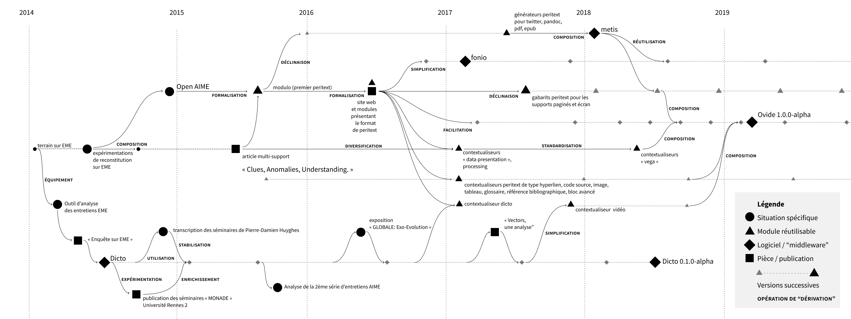 ). Dans ce territoire, je peux alors tracer les différents déplacements qu’a produit l’enchaînement de dérivations qui a caractérisé par pratique du design. Ainsi, dans un premier temps, via une attitude d’équipement conduisant au bricolage de moyens existants, les situations de collaboration rencontrées dans le cadre de ma recherche m’ont conduit à participer à la fabrication de documents-publications expérimentaux dont les formats furent conçus spécifiquement pour une situation de recherche. Dans un deuxième temps, je me suis engagé dans une démarche de stabilisation conduisant à la production de logiciels utilisables et fonctionnels, selon une tendance instrumentale visant à équiper et susciter le développement de pratiques de publication-comme-enquête. Dans un dernier temps, ces logiciels sont devenus le cadre pour de nouvelles pratiques expérimentales en cours ou à venir, ainsi que pour la fabrication itérative de cette thèse. Une telle trajectoire dessine ainsi un espace de possibilités pour les rôles que peuvent prendre les pratiques de design au sein des collectifs de recherche en SHS, sur le registre d’une contribution réciproques entre les dimensions expérimentales et instrumentales d’une tellle activité.Dans lʼart de lʼenquête, le développement de la pensée accompagne et répond continuellement aux flux des matériaux avec lesquels nous travaillons. Ces matériaux pensent en nous comme nous pensons à travers eux. Ici, chaque mise en œuvre constitue une expérimentation, non pas au sens où lʼentendent les sciences de la nature (comme mise à lʼépreuve dʼhypothèses prédéfinies), et pas davantage au sens technologique dʼune confrontation entre des idées ‹ dans la tête › et des faits ‹ sur le terrain ›, mais plutôt au sens dʼun éclaireur qui fraye un chemin et poursuit sa route pour voir où elle le conduit. (Ingold, 2013/2017, p. 32)