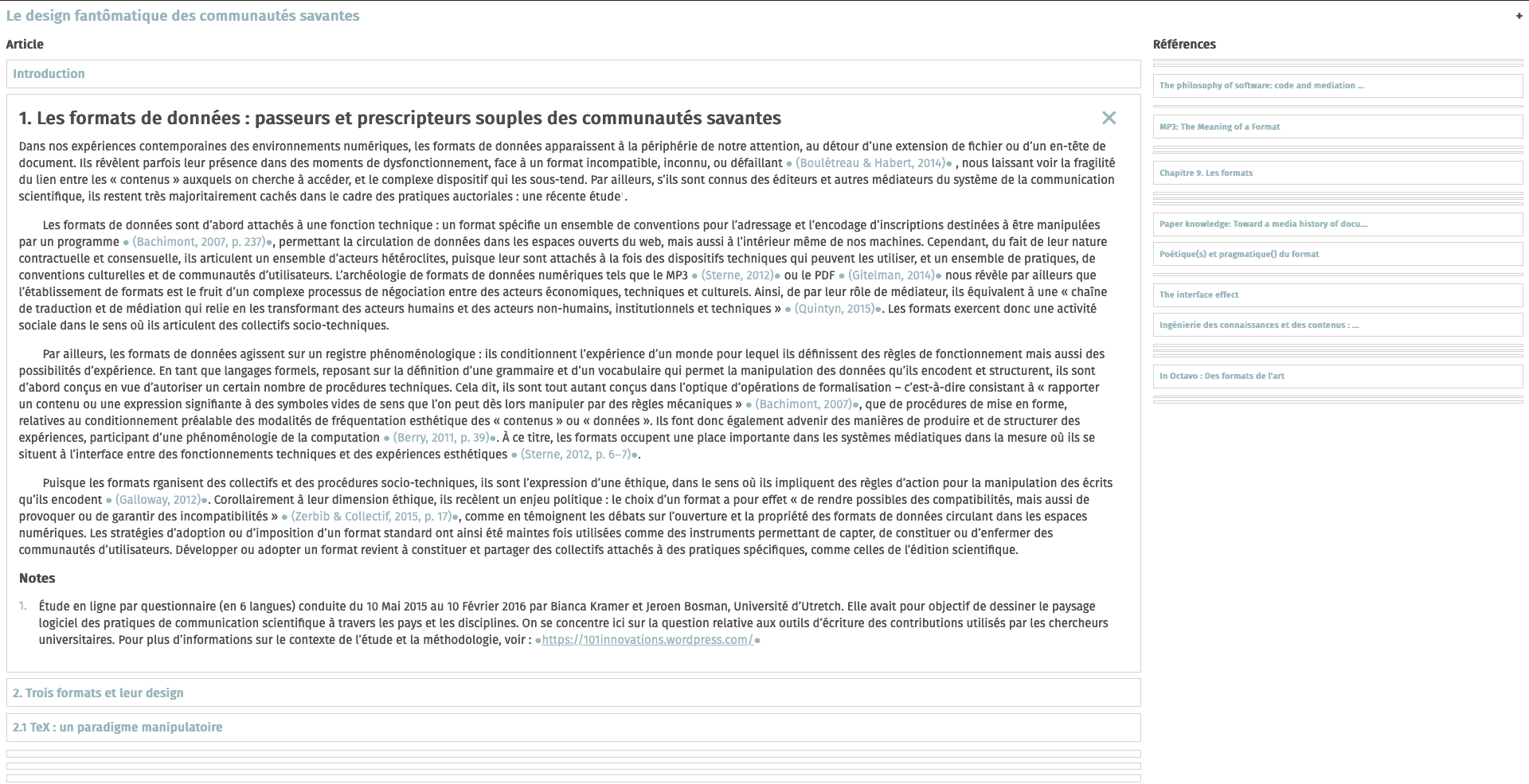 ). La structure potentiellement très complexe des publications est par ailleurs atténuée – voire invisibilisée – par le signalement relativement discret des multiples liens attachés à chacun des éléments visités, et par le caractère monotone et répétitif de son format de lecture89. Il se dégage ainsi, à la lecture d’une publication Scalar, uneDʼune certaine manière, je pense donc que Scalar fonctionne bien en rassemblant votre matériel source et en lʼimportant avant la réalisation de votre publication.90 (Owens, 2018)