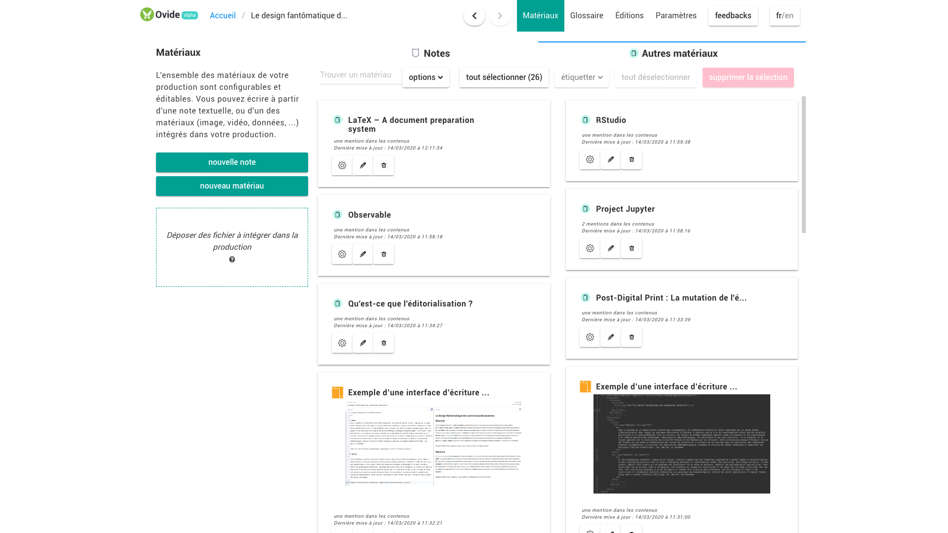 ). Ovide est disponible – comme le logiciel Dicto décrit précédemment – comme une application autonome fonctionnant en ligne ou sous la forme d’une application de bureau. Ce logiciel a fait office d’outil d’écriture et de composition de la présente thèse, lieu d’une nouvelle situation d’articulation entre format d’écriture, format éditorial et format de données – en même temps que son développement a agi comme la démonstration des possibilités du modèle de données Peritext.