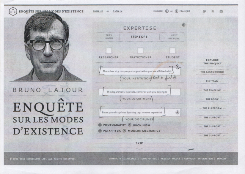 Le design est ainsi mobilisé pour faire une proposition apte à articuler les composantes éditoriales, techniques et scientifiques de l’équipe. En Mars 2012, le livre et les deux plateformes annoncées par le projet se sont transformées en cinq « instances » dédiées à des finalités différentes : la première, l’ouvrage imprimé, doit maintenant faire office de « rapport préliminaire » au moyen d’un texte annoté de symboles typographiques « special words », et d’un tableau croisé représentant les rencontres de modes ; à celle-ci s’ajoute une interface intitulée « trail » (qui deviendra par la suite l’interface « enquête », « livre » ou « colonnes ») qui représente la connexion entre le texte initial et la documentation de Bruno Latour ; cette dernière doit être accompagnée d’un ensemble de visualisations interactives intitulées « concept clouds », permettant de naviguer spécifiquement à travers le vocabulaire de l’ensemble, et d’une entrée « laboratoire » représentant l’ensemble des contenus sous la forme d’un réseau ; ces deux premières entrées numériques, qui ne traitent pas la question de la participation à l’enquête en propre, sont pensées en corrélation avec une entrée intitulée « cube » qui permettrait aux lecteurs d’assembler les concepts sous la forme d’assemblages entre portions de textes et documents. On retrouve dans cette proposition certains des éléments de l’infrastructure telle qu’elle s’est ensuite développée, mais également une dimension distribuée plus importante que ce que le calendrier de l’ensemble de l’entreprise a finalement permis.